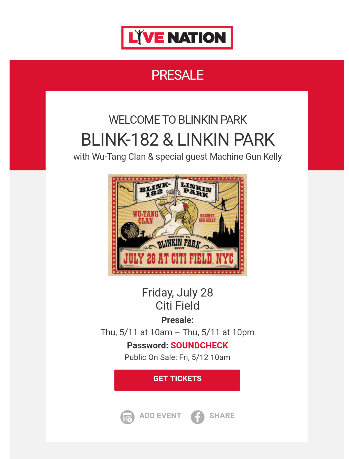Blink 182 & Linkin Park With Wu-Tang Clan & special guest Machine Gun Kelly! This tour is blowing up and this is a great opportunity to flip some tickets.